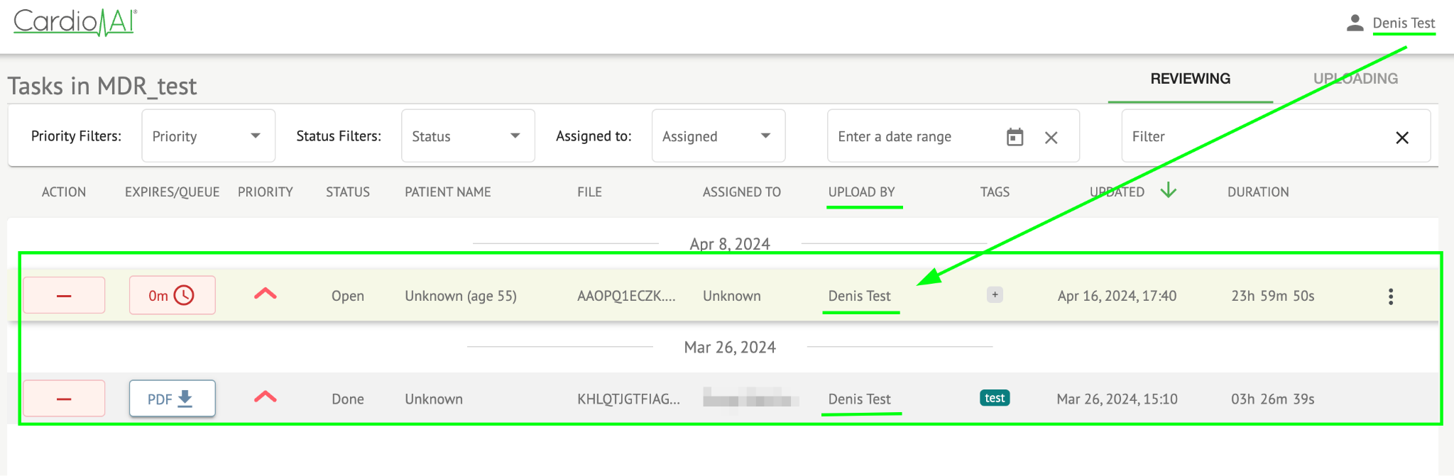 View Own Tasks Enables a user to view the tasks the user uploaded ECG of, under the Reviewing subsection of Tasks.