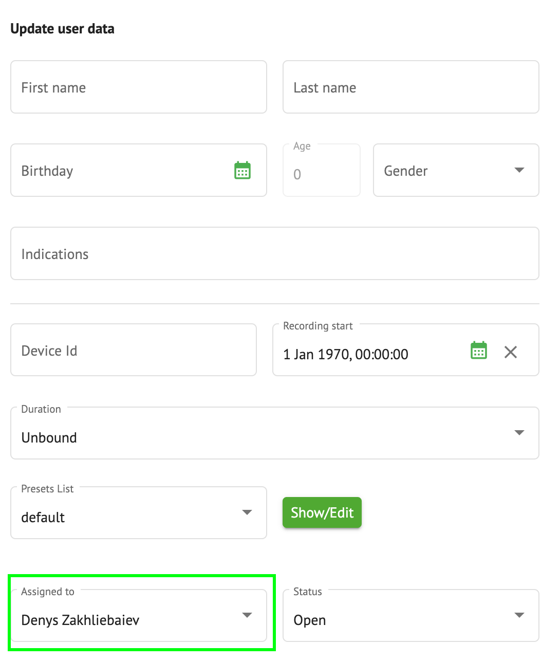 Enables a user to change Assigned to user of the task. under the Edit personal data of the patient.