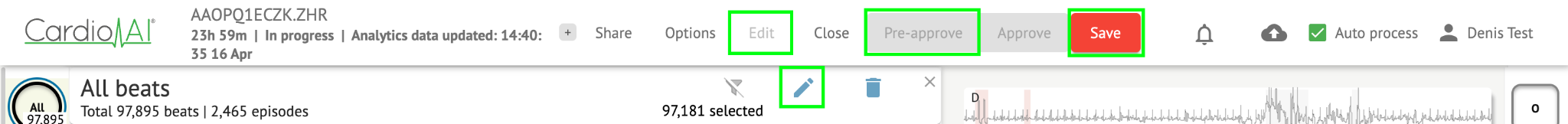 Enables a user to edit the ECG task data, change the annotations, edit the report, save changes of the task and pre-approve the task.