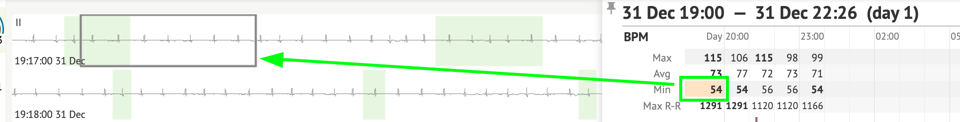 • Strips section - provide additional details or data related to specific events or conditions mentioned earlier. It includes heart rate measurements (in BPM) and timestamps for each event.