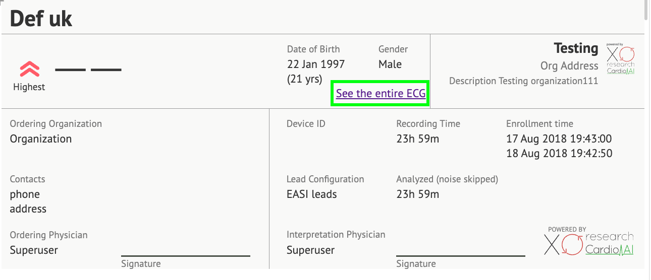 • Personal data section - contains the following information of patient: date of birth, gender, ordering organization, contacts, ordering physician, signature, device id, lead configuration, interpretation physician, recording time, amount of analyzed time, enrollment time;