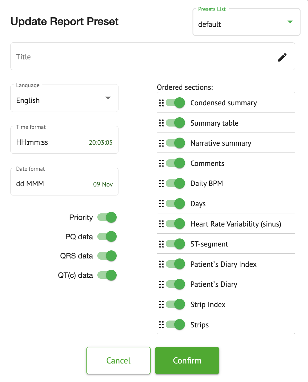 ECG data report sections managing