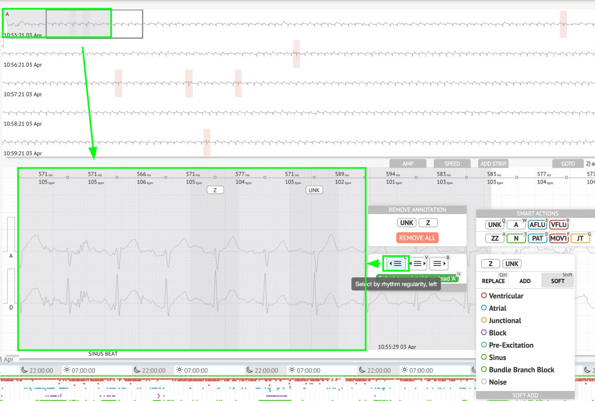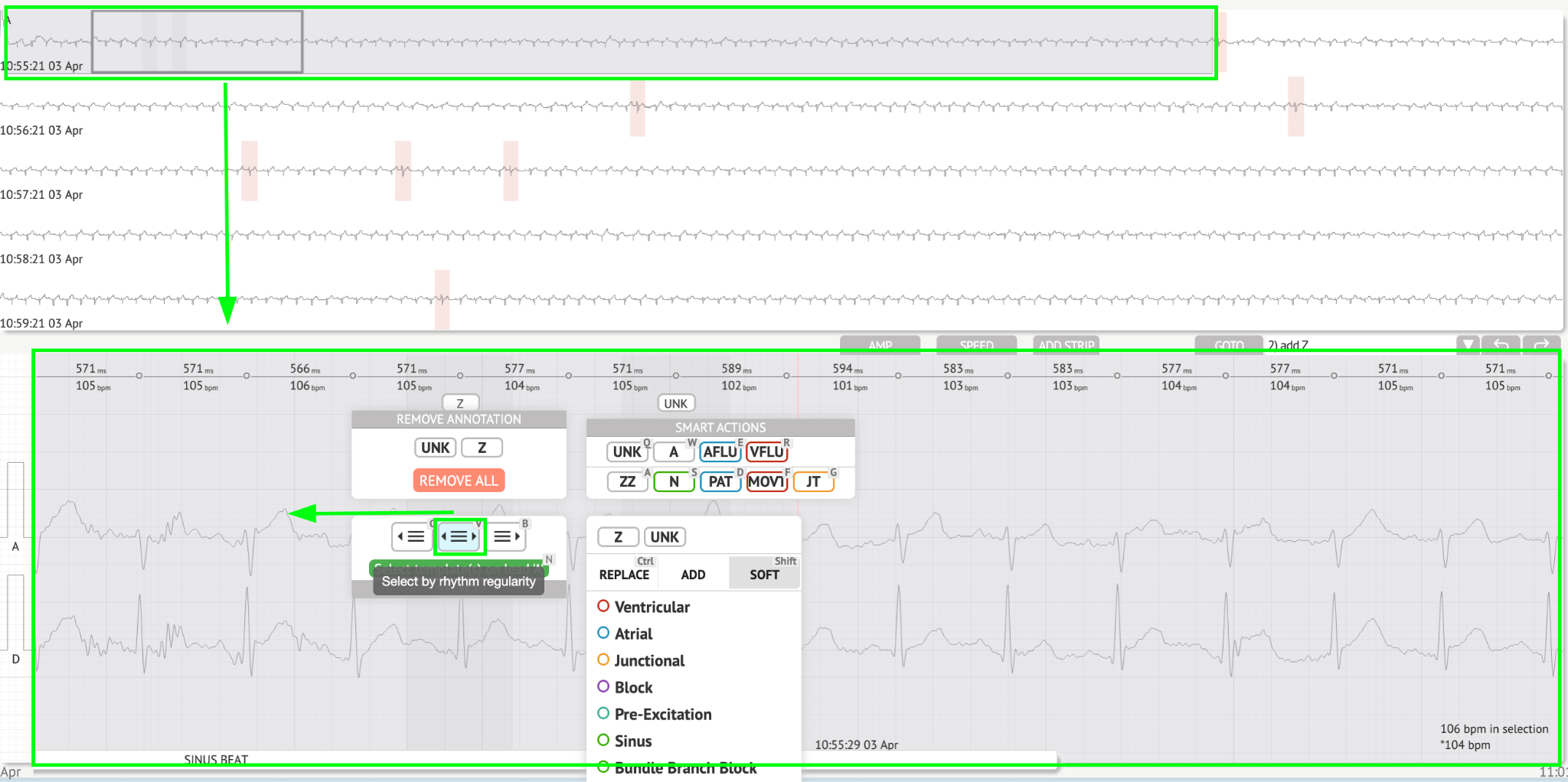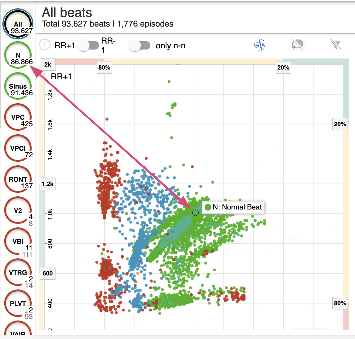 Під бічною панеллю редагування Cardio.AI збирає та показує всі удари, нормальні удари та знайдені анотації. Всі удари виділені чорним кольором, нормальні та синусові удари виділені зеленим кольором, анотації виділені іншими кольорами.