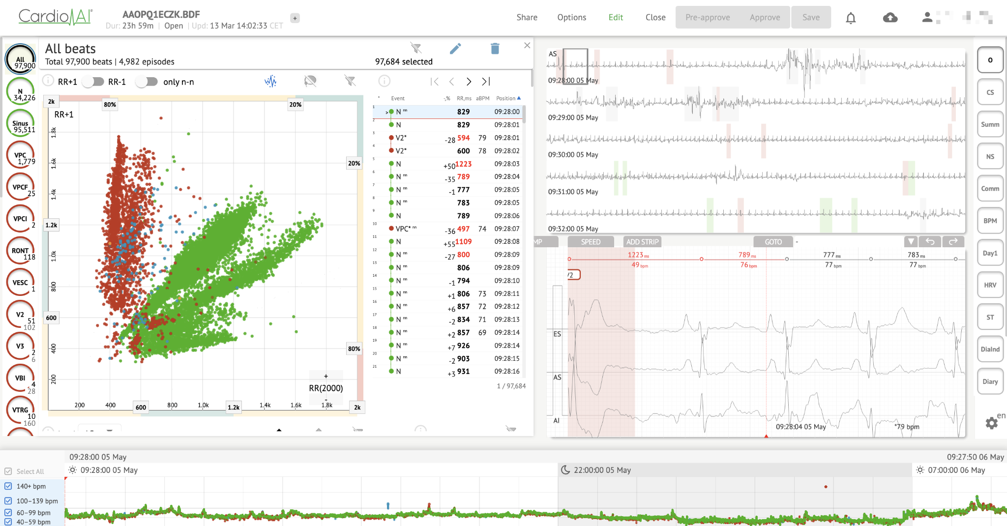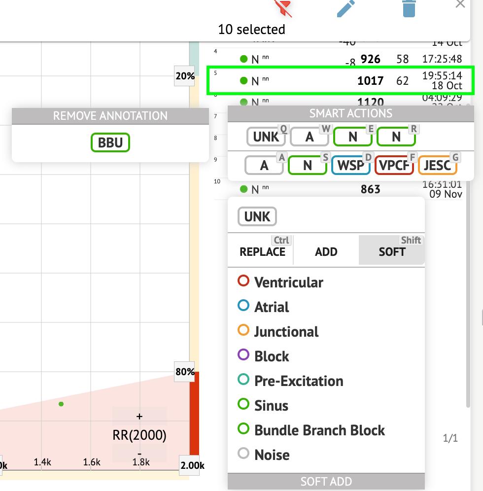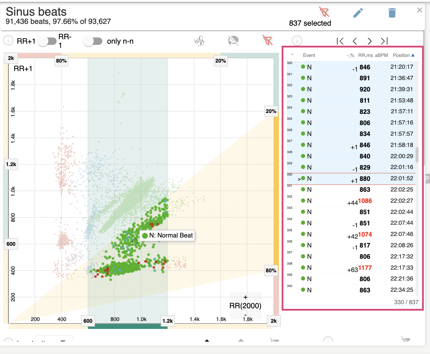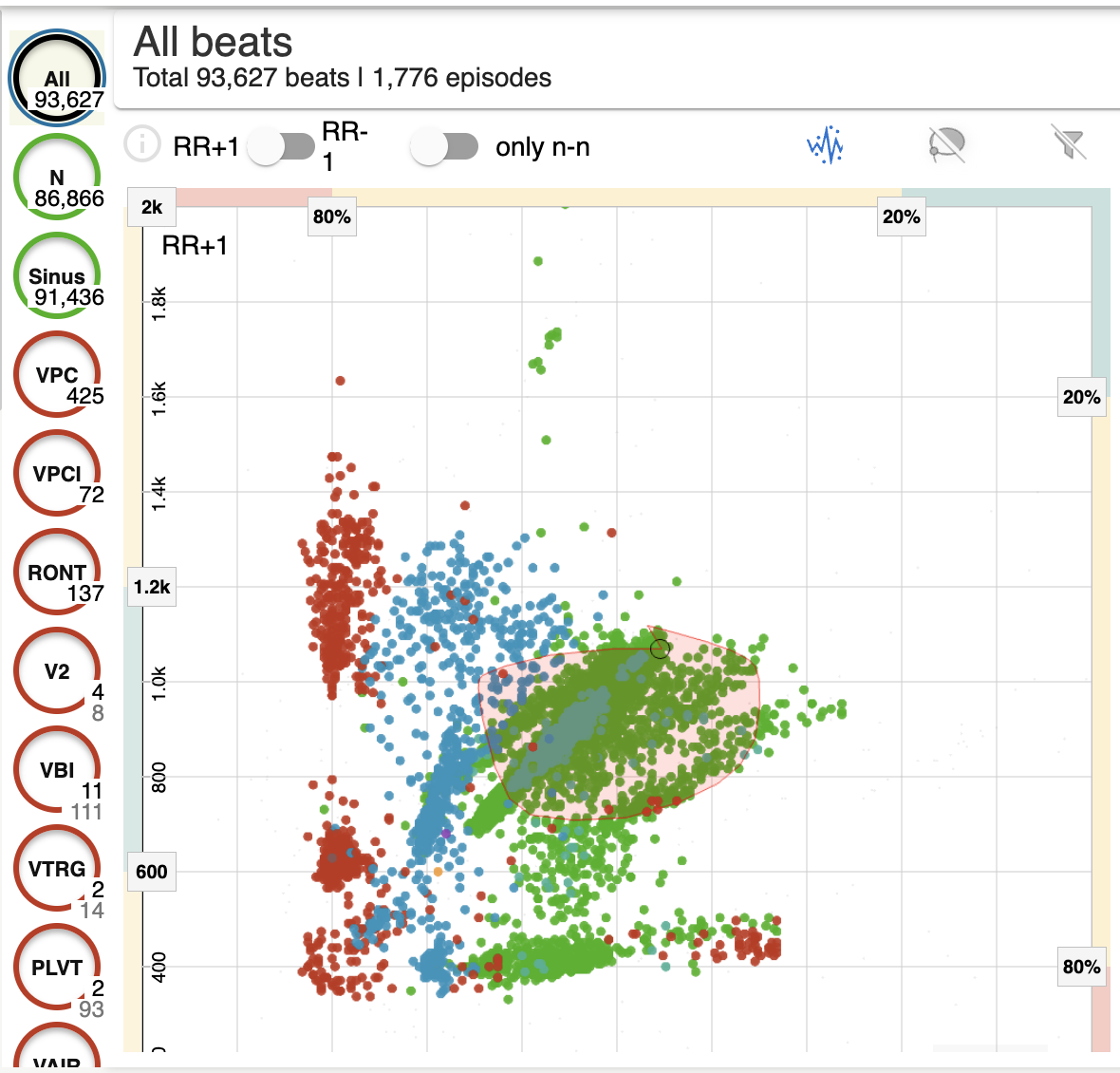 Під бічною панеллю редагування Cardio.AI збирає та показує всі удари, нормальні удари та знайдені анотації. Всі удари виділені чорним кольором, нормальні та синусові удари виділені зеленим кольором, анотації виділені іншими кольорами.