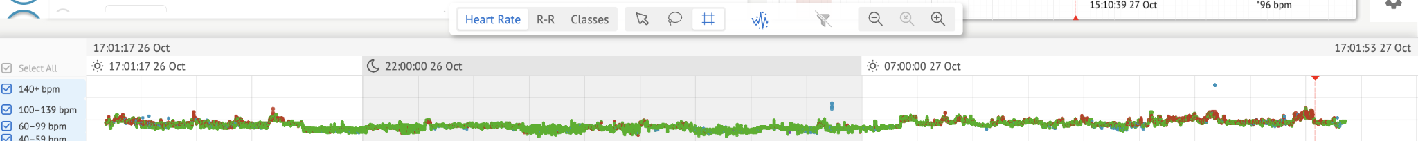 Відображає значення частоти серцевих скорочень у часі, представлені кольоровими маркерами, що відповідають заздалегідь визначеним діапазонам частоти серцевих скорочень.