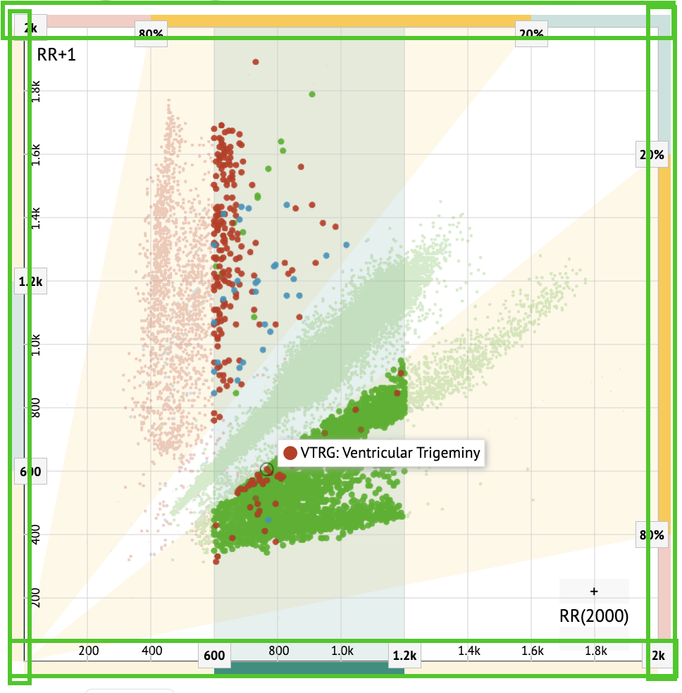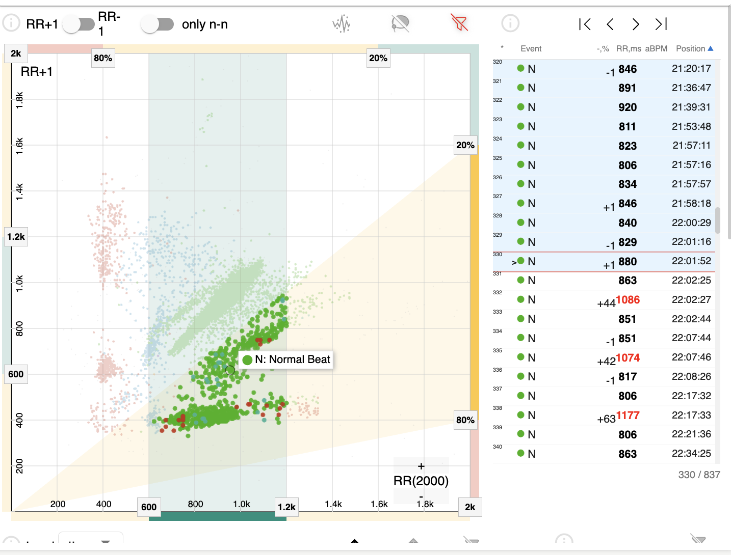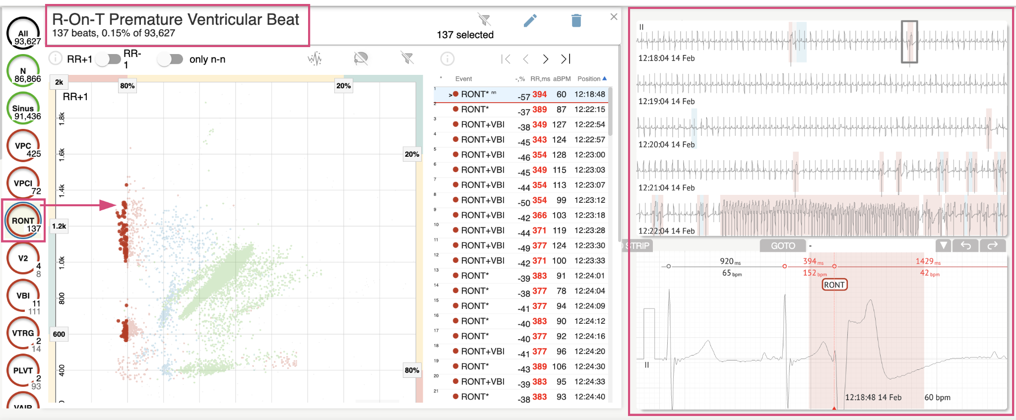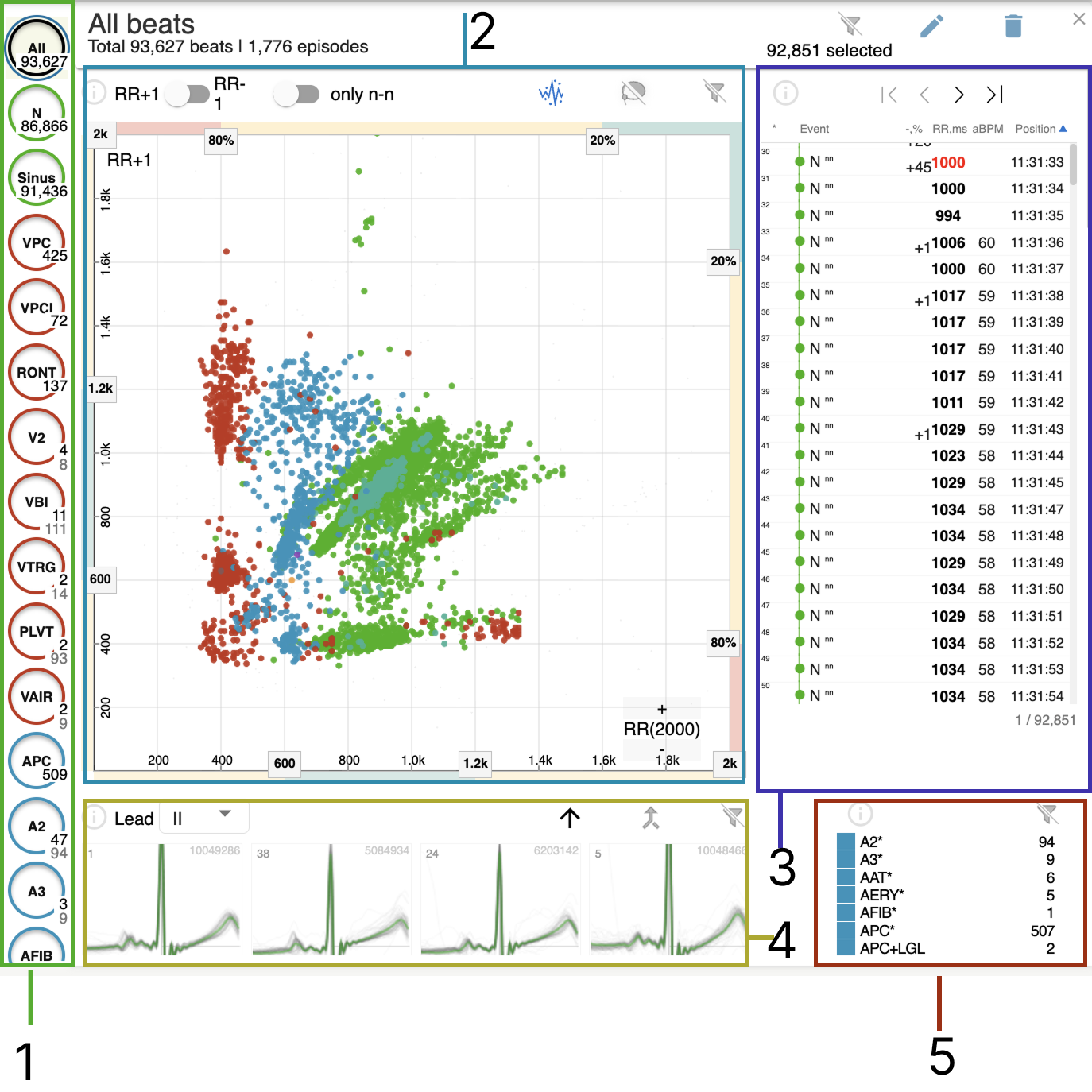 Графік Пуанкаре дозволяє користувачеві переглядати, переглядати та переходити до всіх записаних ударів, включаючи нормальні, та анотації (аномалії).