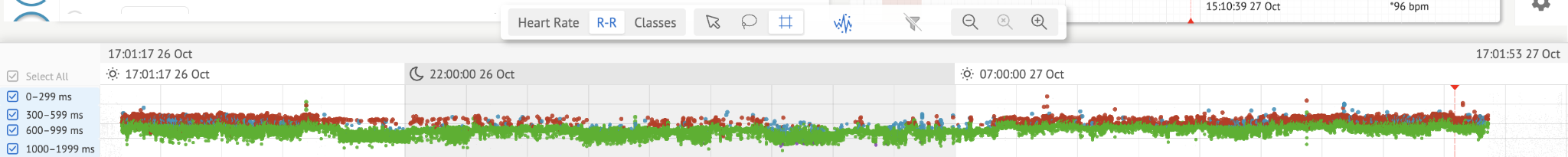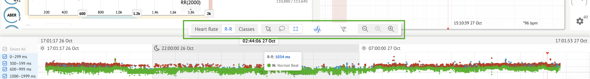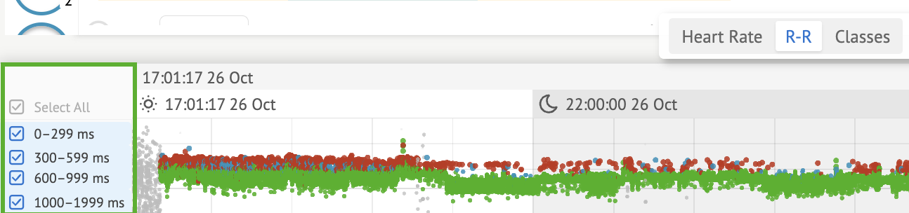 Якщо вибрано режим перегляду інтервалів R-R, можна окремо вмикати або вимикати такі діапазони інтервалів: