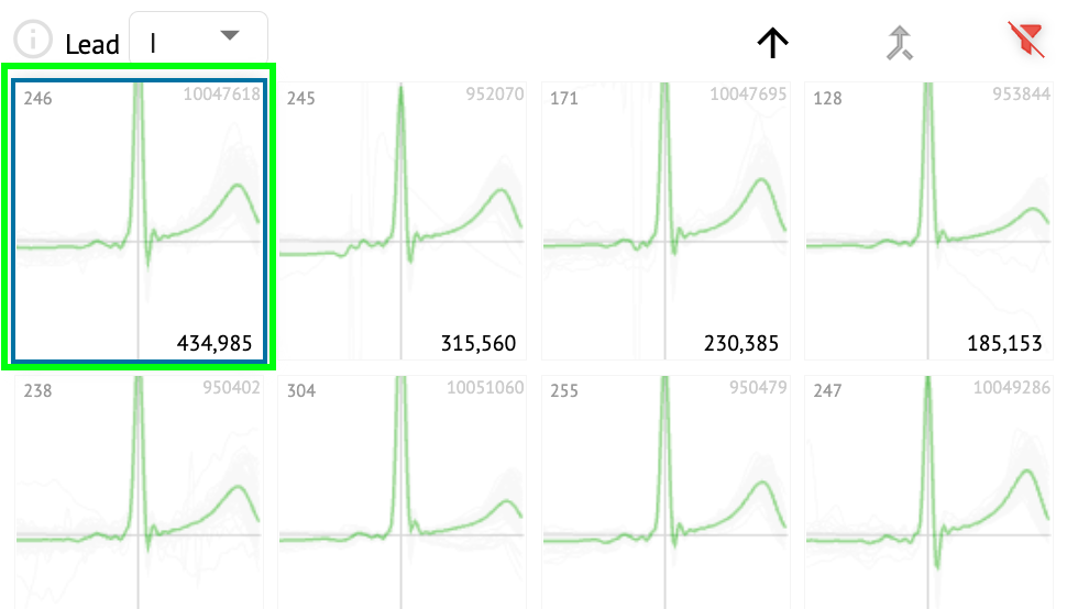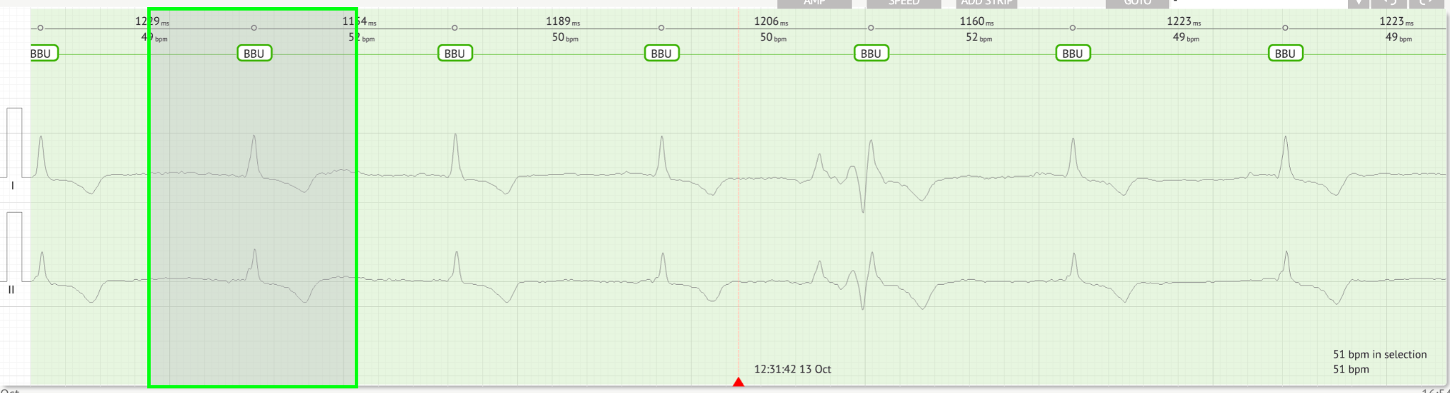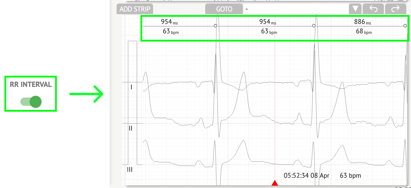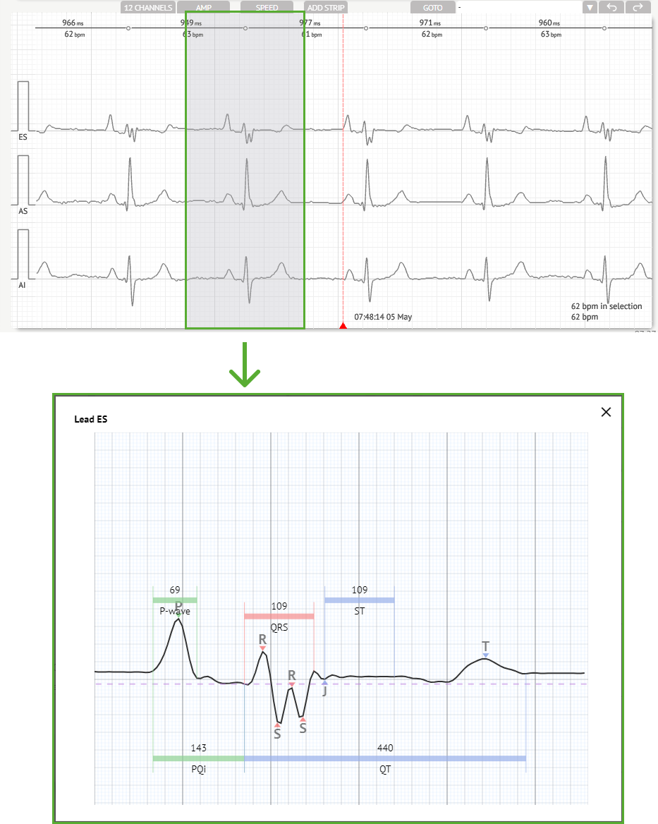 Опція перегляду вимірювань PQRST, розпізнаних штучним інтелектом, доступна шляхом подвійного клацання на ритмі: