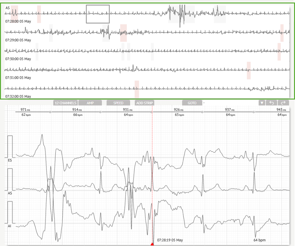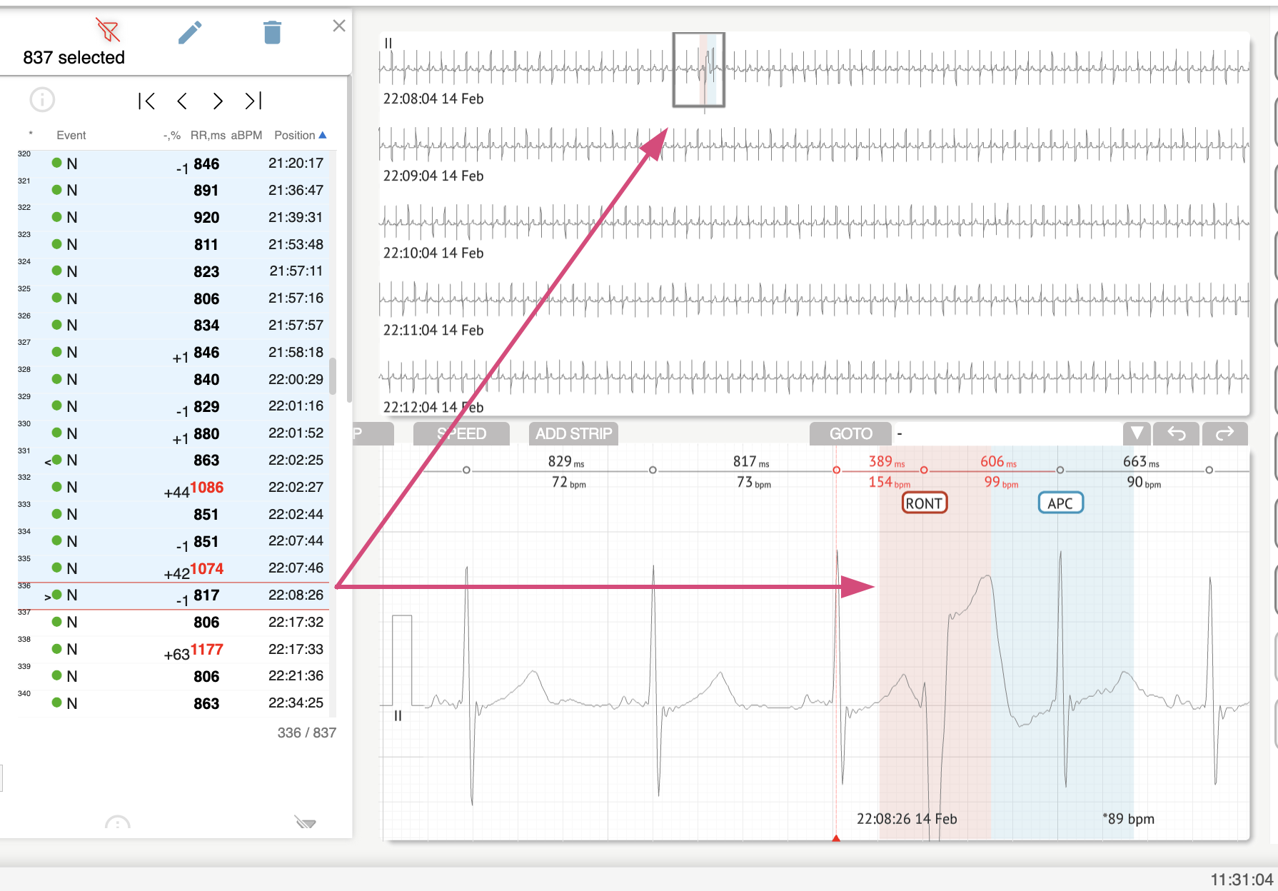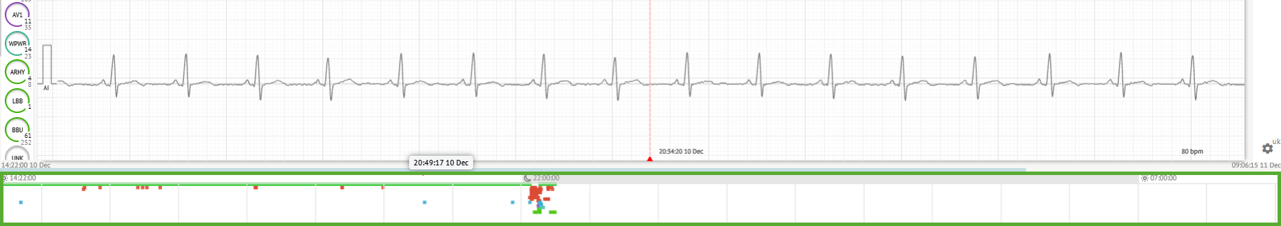Відображає класифіковані удари та події ритму вздовж часової шкали ЕКГ за допомогою маркерів з колірним кодуванням.