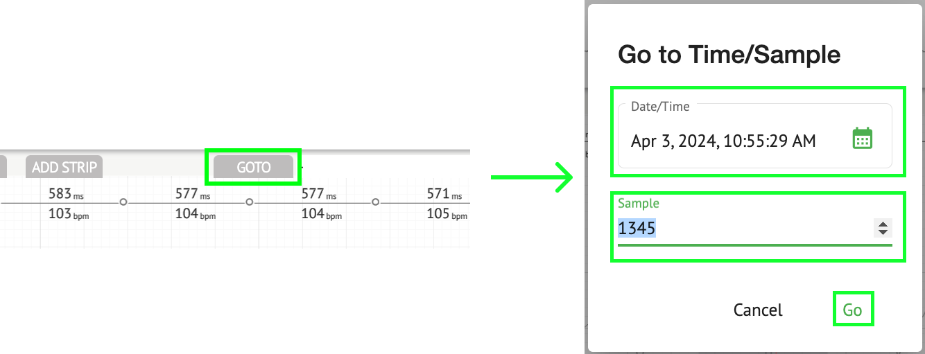 Опція переходу до певного часу / зразка доступна під кнопкою Goto > Виберіть дату і час > Введіть номер зразка > Кнопка Go: