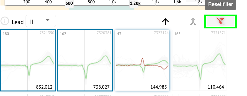Функція «Bird View» розташована в нижній частині вікна перегляду ЕКГ і надає стислий візуальний огляд усього часового діапазону запису ЕКГ. Вона дозволяє швидко переміщатися по даних, переглядати їх та фільтрувати без зміни вихідного сигналу або результатів аналізу.