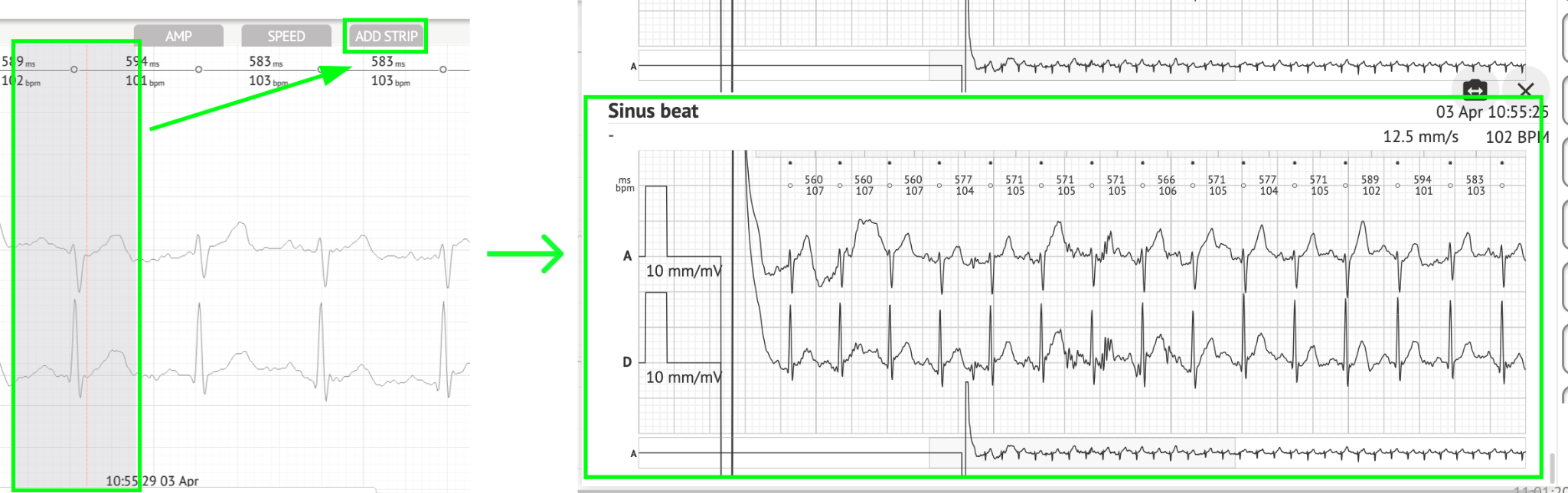 У візуалізаторі переглядача ЕКГ користувач може спостерігати та керувати ударами та анотаціями, що відповідають попередньому перегляду та редактору.