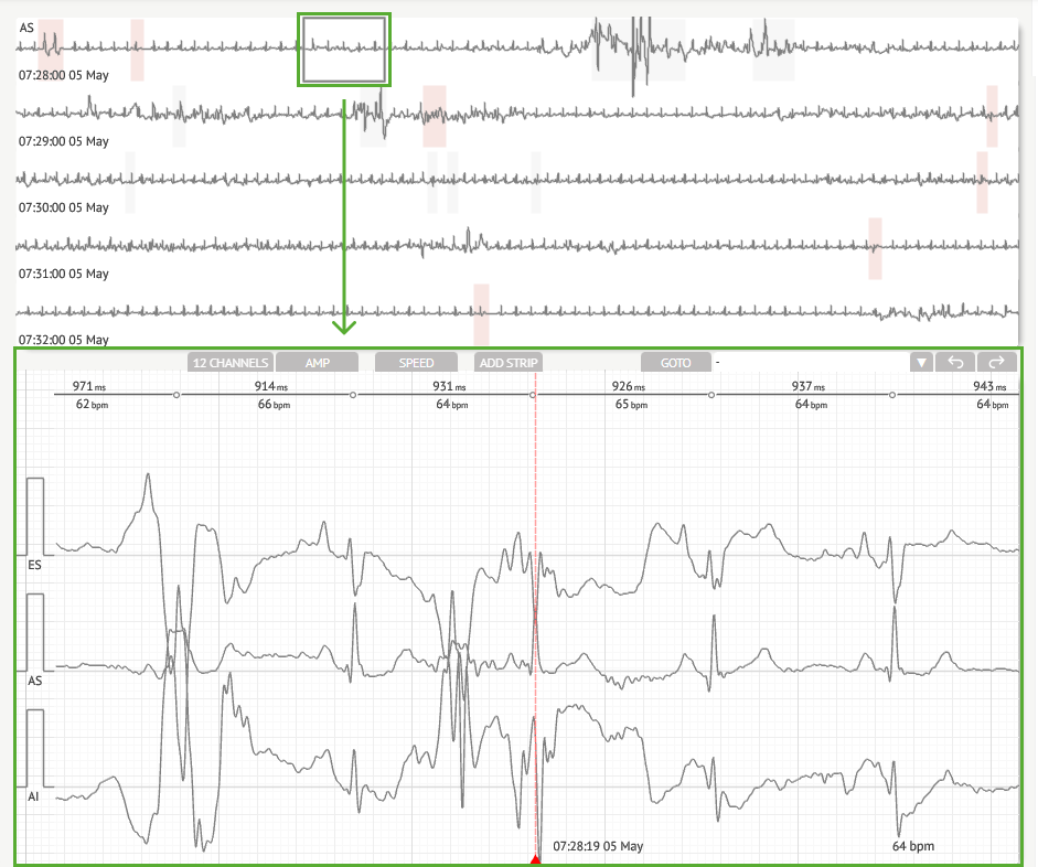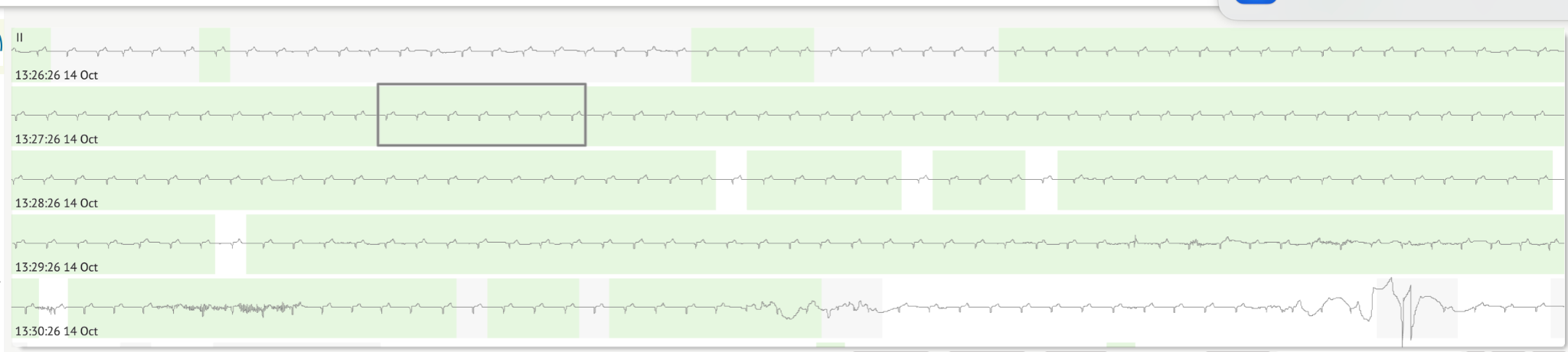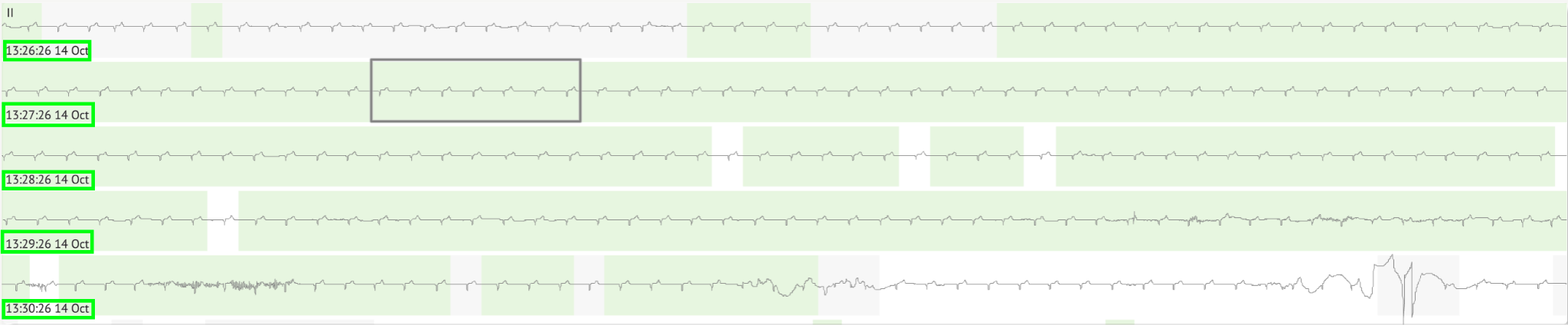 Розділ детальних даних ЕКГ містить розділ попереднього перегляду ЕКГ, розділений на частини для кожної хвилини запису ЕКГ за весь період запису ЕКГ: